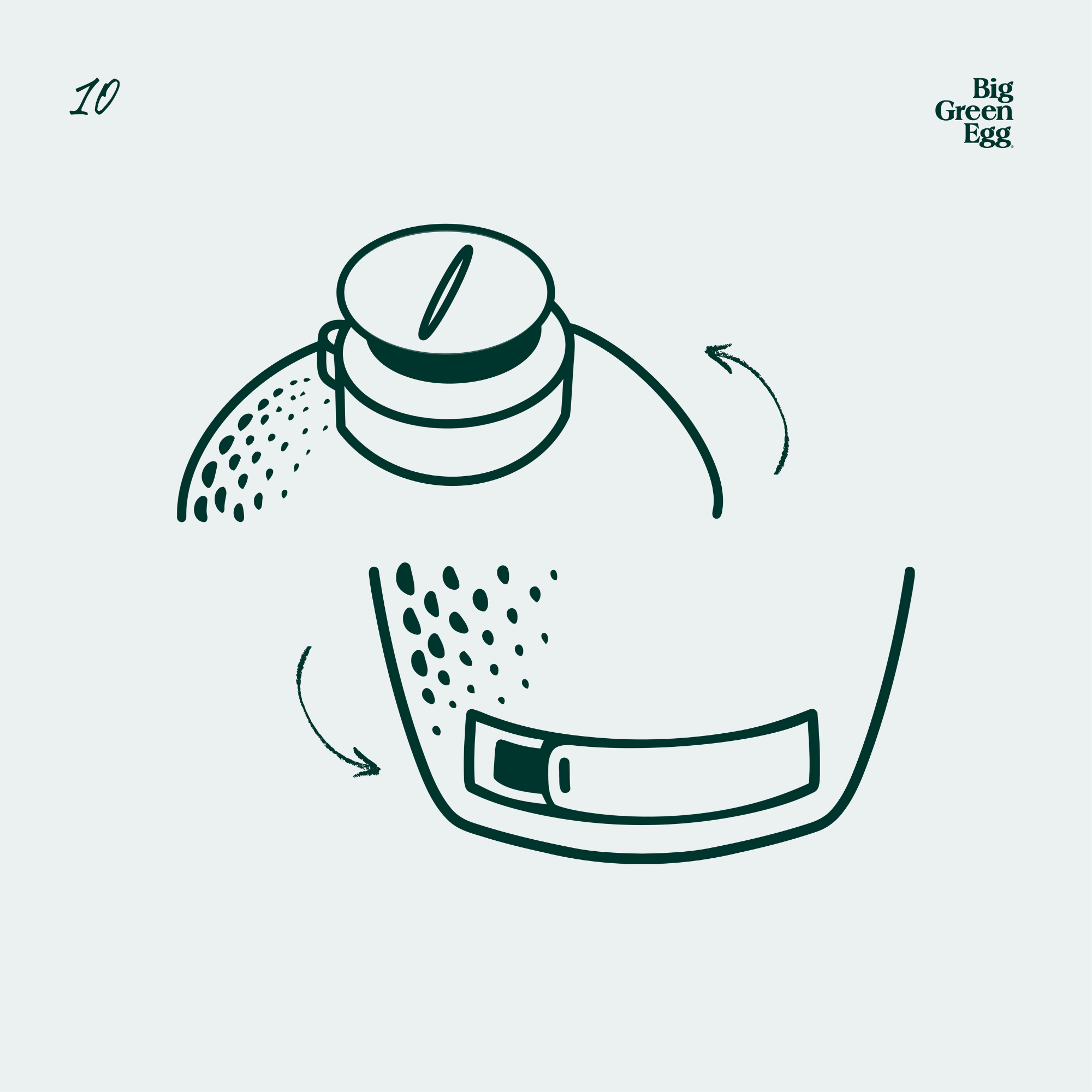 Fill Big Green Egg 100% Natural Lump Charcoal 5cm from the top of the Fire Box rim. Tip: Gently rake with through any charcoal left in the Fire Box with your Ash Tool, to remove any blockages to Fire Grate holes.